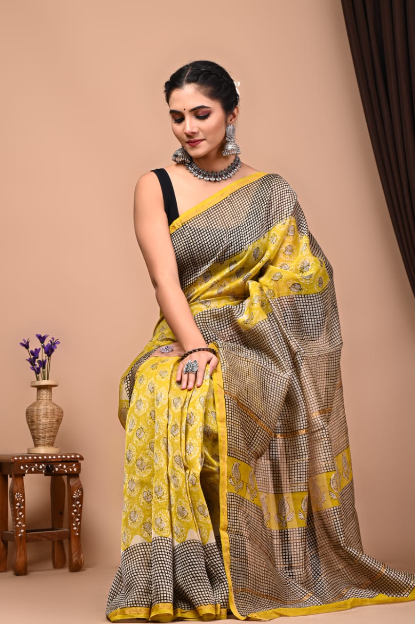Bagru Handblock Exclusive Kilol Rapid Chanderi Silk Saree With Blouse.